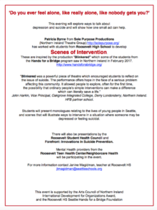 The HFB experience in Northern Ireland can be joyous, but sometimes painful. The statistics on youth suicides in Northern Ireland reveal a tragic picture and this is a topic we discuss on our journey. On our last two visits we watched a play called “Blinkered” about a young man who takes his life and the impact on his family. We are extremely fortunate to have Pat Byrne, the author, at RHS for three weeks, starting May 15th. She will workshop the play with four different classes or blocks, culminating in an event on June 2 in the evening, when RHS students will perform adapted scenes and local mental health organizations and our own THC will facilitate discussion and share local support resources.